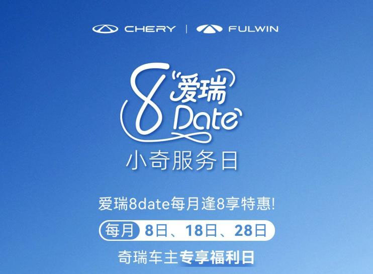 车主们都知道,每个月的8日、18日、28日,是爱瑞8date小奇服务日。每月逢8遍布全国的奇瑞服务站都将同步开启宠粉模式,保养福利、备件福利、精品福利、大额积分等众多好礼,集结发送。