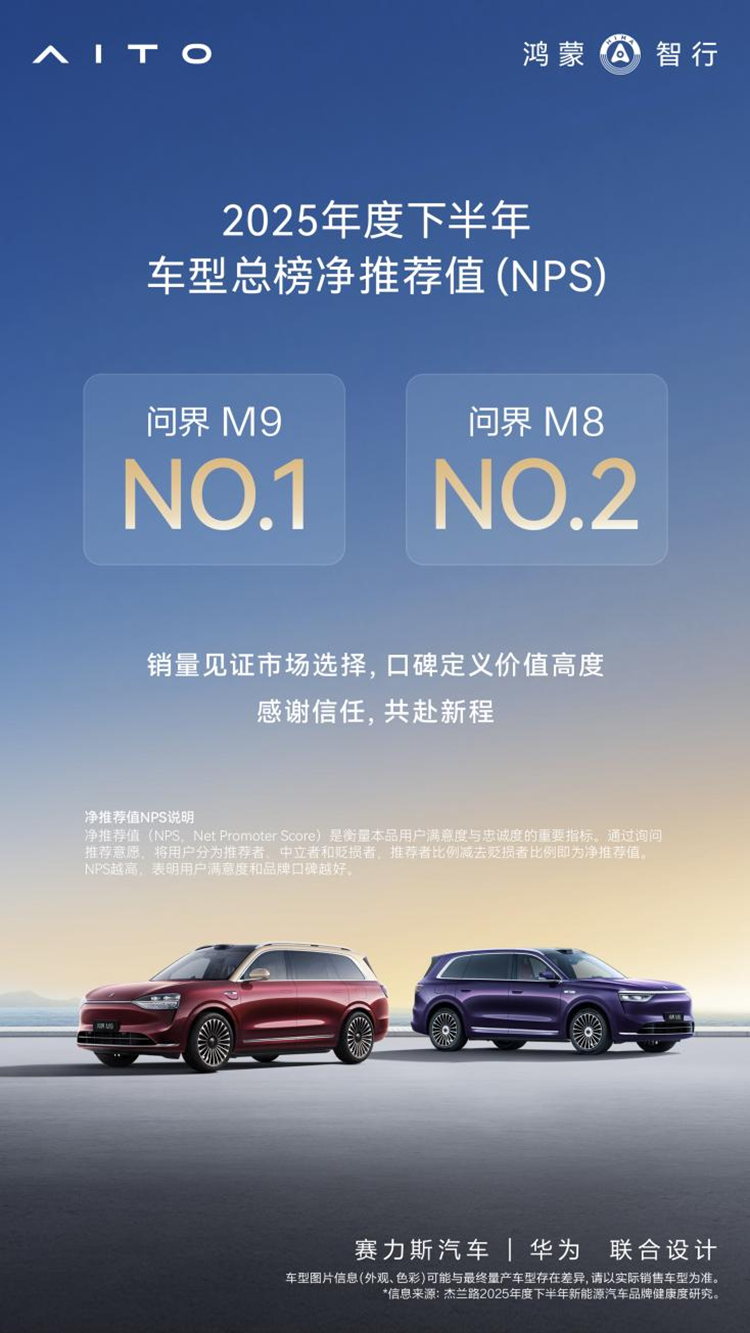据最新数据显示,问界M8上市以来累计交付量已突破17万辆,牢牢占据“40万级SUV销量冠军”的地位。这一数字不仅是销量的胜利,更是口碑的胜利。在杰兰路发布的权威研究中,问界M8的净推荐值(NPS)高达88.7,与问界M9包揽榜单TOP1和2。这意味着,很多车主都在自发向身边的朋友推荐这款“家庭智慧旗舰SUV”。