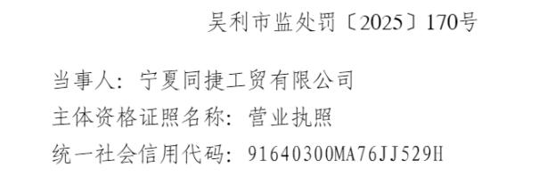 吴利市监处罚〔2025〕170号行政处罚决定书显示,2025年6月19日,根据日常工作中发现的问题线索,吴忠市市场监督管理局利通区分局执法人员依法对当事人进行现场检查。该公司生产厂房内有该公司生产的5种不同规格包装的食品用洗洁精及生产设施设备,该公司不能提供《工业产品生产许可证》。