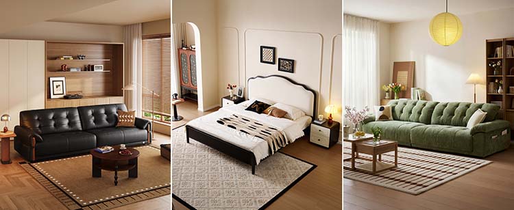 全友深度洞察当代年轻人审美趋势,成品线涵盖沙发、床垫、软床、餐桌、墙面家居、橱柜、卫浴、窗帘和板式套房家具等,以多元风格设计打造高颜值家居产品。从面料肌理、线条比例到色彩搭配,都体现了居家审美与生活情调,可适配奶油风、中古风、原木风、宋式美学等多种装修风格,满足消费者对理想美家的向往。