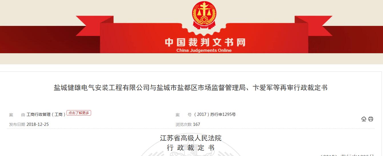 再审申请人盐城健雄电气安装工程有限公司(以下简称健雄公司)诉盐城市盐都区市场监督管理局(以下简称盐都区市场监管局)工商行政处罚一案,不服江苏省盐城市中级人民法院(2016)苏09行终498号行政判决,向本院申请再审。本院依法组成合议庭对本案进行了审查,现已审查终结。