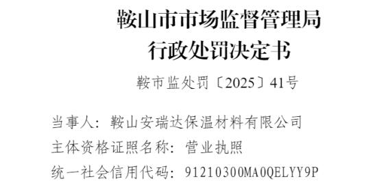 中国品牌与防伪杂志/中国消费品质量投诉网讯 近日,鞍山安瑞达保温材料有限公司(以下简称“鞍山安瑞达”)因涉生产、销售不合格产品,依据相关法律法规,对该公司处以罚没款8449.06元。