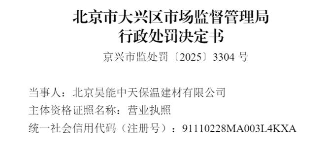 京兴市监处罚〔2025〕3304号行政处罚决定书显示,2025年7月30日,北京市大兴区市场监管局接到北京市市场监督管理局移交的产品质量监督抽查不合格材料。检验报告表明当事人生产销售的岩棉板,经抽样检验,密度允许偏差项目不合格。