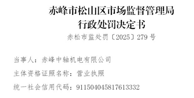 赤松市监处罚〔2025〕279号行政处罚决定书显示,2025年7月11日,赤峰市松山区市场监督管理局接到瓦房店轴承集团有限公司报案书,称赤峰市松山区市场监督管理局辖区赤峰中轴店内销售侵犯其注册商标“ZWZ”专用权的轴承产品,要求查处。