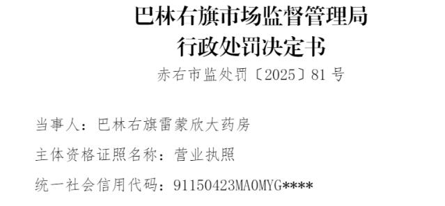赤右市监处罚〔2025〕81号行政处罚决定书显示,2025年7月21日,巴林右旗市场监督管理局执法人员对巴林右旗雷蒙欣大药房进行监督检查,检查中发现:该药店执业药师不在岗销售处方药。