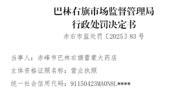 赤右市监处罚〔2025〕83号行政处罚决定书显示,2025年7月21日,巴林右旗市场监督管理局执法人员对当事人进行监督检查,检查中发现:该药店执业药师不在岗销售处方药。