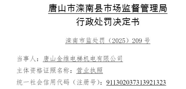 中国品牌与防伪杂志/中国消费品质量投诉网讯 近日,唐山金维电梯机电有限公司(简称“唐山金维电梯”)因涉未按要求对电梯进行维护保养,依据相关法律法规,对该公司处以罚款10200元。