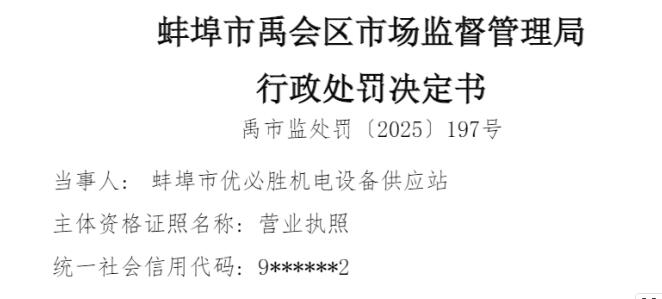 中国品牌与防伪杂志/中国消费品质量投诉网讯 近日,蚌埠市优必胜机电设备供应站(以下简称“蚌埠优必胜”)因涉销售侵犯注册商标专用权商品,依据相关法律法规,对该供应站处以罚款6945.5元。