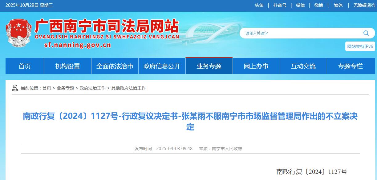 申请人张某雨不服被申请人南宁市市场监督管理局(以下简称“市市场监管局”)作出的不立案决定,于2024年9月2日向本机关申请行政复议,本机关已予以受理。现已审理终结。