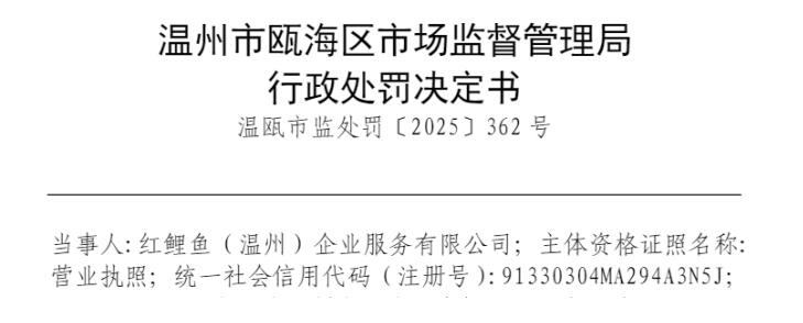 中国品牌与防伪杂志/中国消费品质量投诉网讯 近日,红鲤鱼(温州)企业服务有限公司(以下简称“温州红鲤鱼”)因涉提交虚假证明文件,依据相关法律法规,对该公司处以罚款6000元。