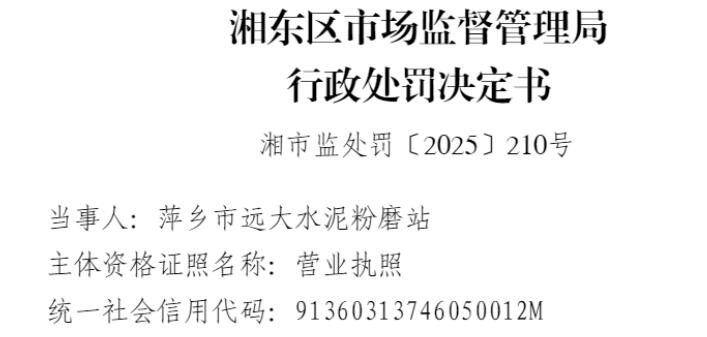 中国品牌与防伪杂志/中国消费品质量投诉网讯 近日,萍乡市远大水泥粉磨站(以下简称“萍乡远大水泥”)因涉生产销售不合格水泥,依据相关法律法规,对该水泥粉磨站处以罚款20880元。