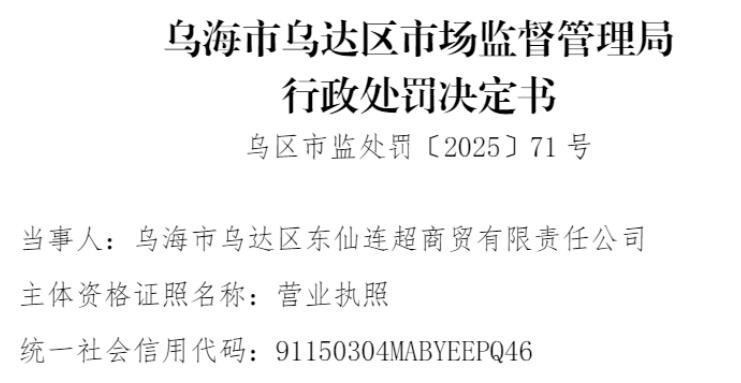 中国品牌与防伪杂志/中国消费品质量投诉网讯 近日,乌海市乌达区东仙连超商贸有限责任公司(以下简称“乌海东仙连超”或“当事人”)因涉儿童牙膏未在销售包装展示面标注小金盾,依据相关法律法规,对该公司处以罚没款2388.8元。