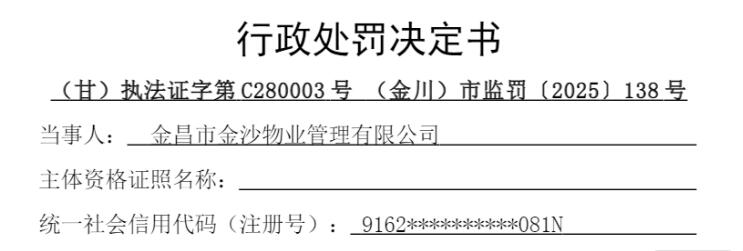 (甘)执法证字第C280003号(金川)市监罚〔2025〕138号行政处罚决定书显示,2025年5月20日由金昌市金川区市场监督管理局行政执法人员对当事人开展检查。该公司业务经理王某萍现场表示,该公司现在是按照2.8元/m3的价格收取住宅水费。