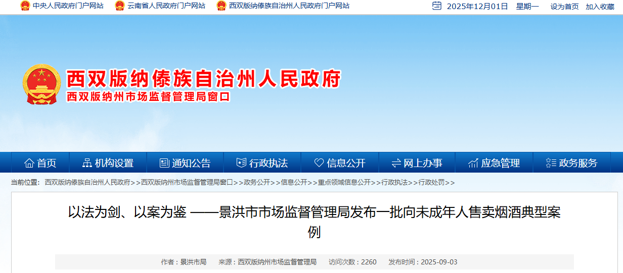 保护未成年人,事关社会稳定和家庭幸福、国家前途和民族命运。景洪市市场监督管理局为贯彻景洪市预防和整治涉未成年人违法犯罪突出问题“利剑护蕾”专项行动暨“百日攻坚”行动,立足本职,充分发挥以法为剑、以案为鉴作用,严厉查处市场领域涉及未成年人保护方面的违法行为,为全市未成年人健康成长营造了良好的市场环境。现发布一批向未成年人售卖烟酒侵害未成年人权益典型案例。
