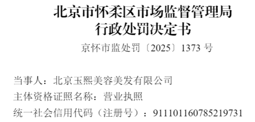 京怀市监处罚〔2025〕1373号行政处罚决定书显示,2025年3月17日,接到关于北京玉熙美容美发有限公司的案源。