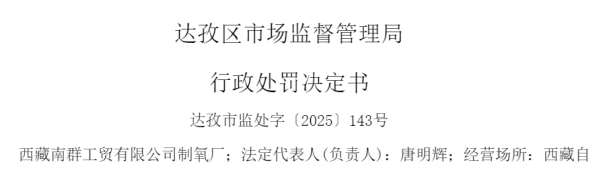 中国品牌与防伪杂志/中国消费品质量投诉网讯 近日,西藏南群工贸有限公司制氧厂(以下简称“西藏南群制氧厂”或“当事人”)因涉充装未经定期检验的气瓶,依据相关法律法规,对该公司处以罚款90000元。