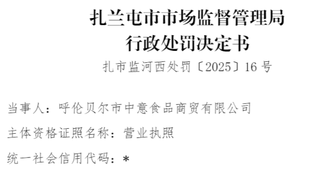 中国品牌与防伪杂志/中国消费品质量投诉网讯 近日,呼伦贝尔市中意食品商贸有限公司(以下简称“呼伦贝尔中意食品”或“当事人”)因涉生产经营标签不符合规定食品,依据相关法律法规,对该公司处以罚没款2450元。