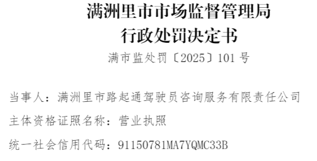 满市监处罚〔2025〕101号行政处罚决定书显示,2025年6月18日,内蒙古消保中心转交满洲里市市场监督管理局的边城资讯(mzlbczx)公众号“驾校招生!好消息,没有驾照的朋友看这里”广告中有“驾照包过”广告词语,该广告对教育、培训的效果作出明示的保证性承诺,根据上述线索,执法人员经与边城资讯(mzlbczx)公众号的经营人当事人进行核实,确认了上述广告发布人。