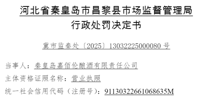 中国品牌与防伪杂志/中国消费品质量投诉网讯 近日,秦皇岛嘉佰伦酿酒有限责任公司(以下简称“秦皇岛嘉佰伦酿酒”或“当事人”)因涉生产的食品标签虚假标注,依据相关法律法规,对该公司处以罚没款10800元。