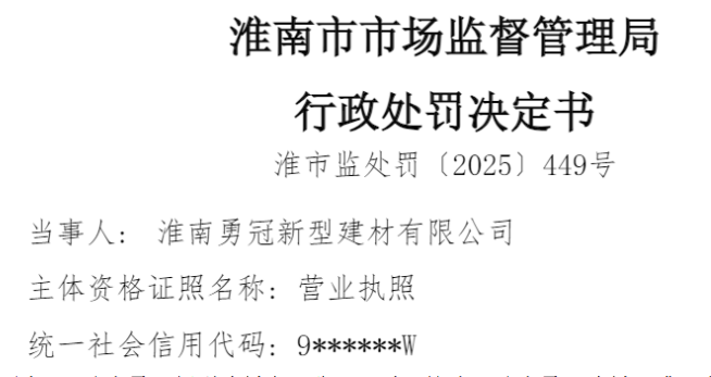 中国品牌与防伪杂志/中国消费品质量投诉网讯 近日,淮南勇冠新型建材有限公司(以下简称“淮南勇冠建材”或“当事人”)因涉生产销售以不合格产品冒充合格产品,依据相关法律法规,对该公司处以罚没款10840.32元。