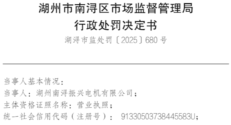 湖浔市监处罚〔2025〕680号行政处罚决定书显示,2025年9月11日,湖州市南浔区市场监督管理局执法人员前往当事人经营场所现场检查,在当事人车间内找到四款未经强制性产品认证的电机。经现场询问,当事人现场未能提供相关产品的出厂、销售产品的强制性认证材料。