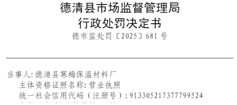 德市监处罚〔2025〕681号行政处罚决定书显示,2025年7月8日,执法人员收到浙江方圆检测集团股份有限公司出具的检验报告,显示2025年5月19日德清县市场监督管理局委托浙江方圆检测集团股份有限公司对当事人生产的绝热用玻璃棉板经抽样并检验,结论为不合格。
