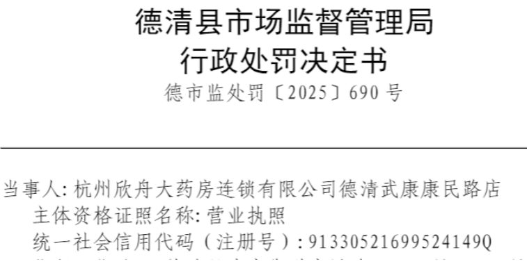 德市监处罚〔2025〕690号行政处罚决定书显示,2025年9月10日,德清县市场监督管理局执法人员依法对当事人经营场所现场检查,现场检查时初级药师蔡某莉在场,执业药师章某英未在场。经初步审查,2025年8月21日至27日,当事人在执业药师章某英未打卡且未在岗的情况下,仍在销售处方药。