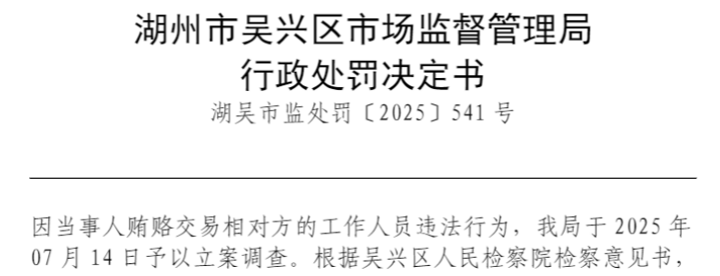 湖吴市监处罚〔2025〕541号行政处罚决定书显示,当事人贿赂交易相对方的工作人员违法行为,湖州市吴兴区市场监督管理局于2025年7月14日予以立案调查。