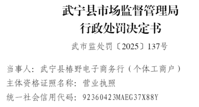 中国品牌与防伪杂志/中国消费品质量投诉网讯 近日,武宁县椿野电子商务行(以下简称“武宁椿野商务行”或“当事人”)因涉销售侵犯注册商标专用权商品,依据相关法律法规,对该公司处以罚没款5085.8元。