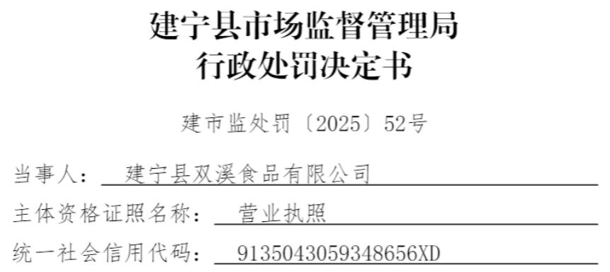 中国品牌与防伪杂志/中国消费品质量投诉网讯 近日,建宁县双溪食品有限公司(以下简称“建宁双溪食品”或“当事人”)因涉生产经营标签不符合食品安全标准的食品,依据相关法律法规,对该公司处以罚没款6219元。