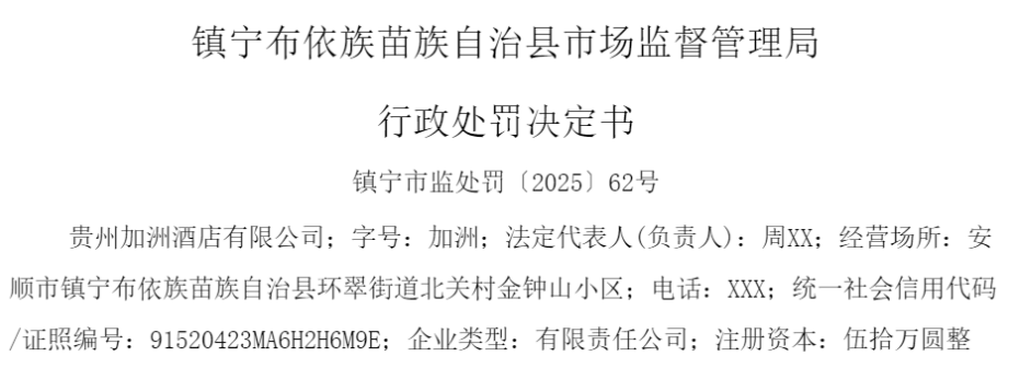 镇宁市监处罚〔2025〕62号行政处罚决定书显示,2025年6月28日,镇宁布依族苗族自治县市场监督管理局收到安顺市12345投诉,投诉人称“因近期马拉松比赛镇宁县所有酒店存在临时加价行为,例如镇宁县加州酒店,平时双人标间84元,现临时加价为425元”的情况。