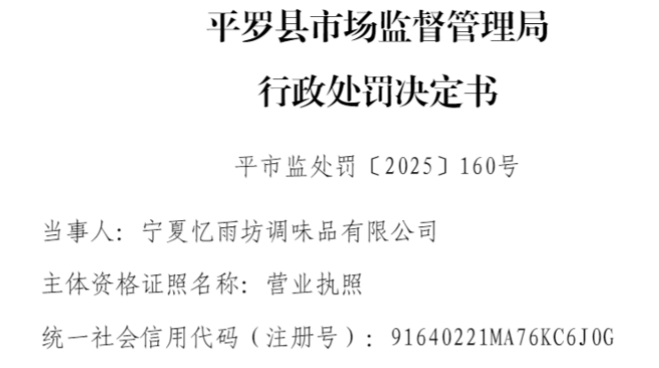 平市监处罚〔2025〕160号行政处罚决定书显示,2025年9月24日,平罗县市场监督管理局接到宁夏市场监管投诉举报平台12315投诉工单,杜先生投诉称:“其购买的宁夏忆雨坊调味品有限公司生产的忆雨坊石磨辣椒粉,该产品为预包装食品,该产品外包装未按食品安全法规定标注营养成分表,违反食品安全法规定,生产日期为2025.6.5。”