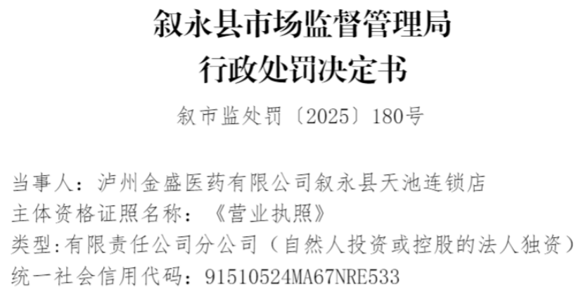 叙市监处罚〔2025〕180号行政处罚决定书显示,2025年8月22日,叙永县市场监督管理局依法对当事人开展日常检查,执法人员在该药店拆零专柜发现1盒标称多寿吉®多潘立酮片的药品陈列待售,在该药品正面显示以下信息:“多寿吉®多潘立酮片,胃肠促动力药,每片含多潘立酮10毫克,国药准字H20093779,规格:30片/盒”,在该药品侧面显示以下信息:“产品批号:2T1H46,有效期至:2025/07,生产日期:2022/08/24”,该药品在拆零专柜呈现已开封状态,现场核查该盒药品数量,剩余13片。