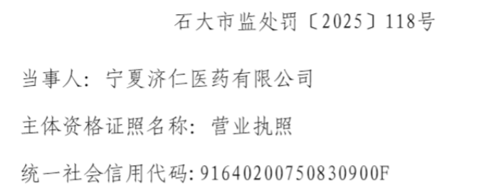 石大市监处罚〔2025〕118号行政处罚决定书显示,2025年7月28日,执法人员接到消费者投诉举报材料,称其于2025年7月22日在宁夏济仁医药有限公司福祥店(当事人分公司)购买的妙可医蚊不叮花露水产品,存在标签与备案、监管公告冲突的违法行为。