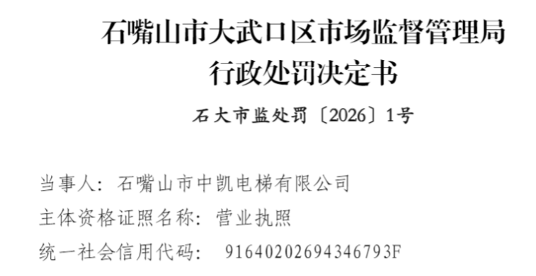 石大市监处罚〔2026〕1号行政处罚决定书显示,2025年9月17日,石嘴山市大武口区市场监督管理局接到宁夏市场监管投诉举报平台举报单,反映当事人在电梯维保过程中存在多项违规操作:一是未按法律规定及安全技术规范要求进行电梯维护保养;二是维保人员不在本地或未从事特种设备行业;三是电梯检验检测提出问题后虚假整改。