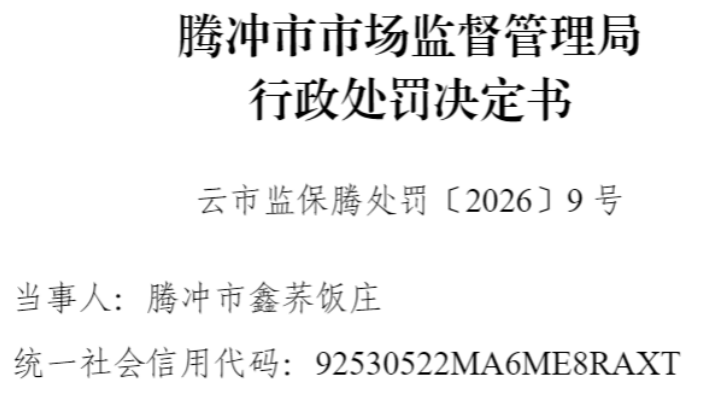 云市监保腾处罚〔2026〕9号行政处罚决定书显示,2025年10月14日,腾冲市市场监督管理局执法人员依法对当事人开展检查,发现该餐馆后厨内摆有超过保质期的食品原材料有“泡椒”2袋、“单山蘸水”2袋、“老坛酸菜鱼调料”2袋。