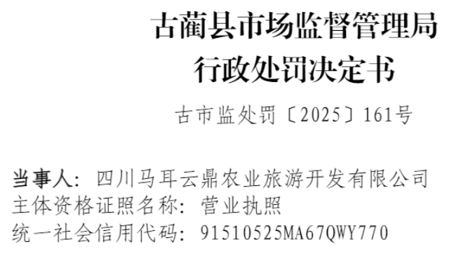 中国品牌与防伪杂志/中国消费品质量投诉网讯 近日,四川马耳云鼎农业旅游开发有限公司(以下简称“马耳云鼎农业旅游”或“当事人”)因涉无证从事餐饮服务经营活动,依据相关法律法规,对该公司处以罚没款5970元。