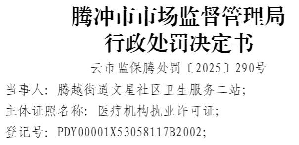 中国品牌与防伪杂志/中国消费品质量投诉网讯 近日,腾越街道文星社区卫生服务二站(以下简称“腾越文星社区卫生服务二站”或“当事人”)因涉未从合法渠道购进药品的行为,依据相关法律法规,对该公司处以罚没款5049.8元。