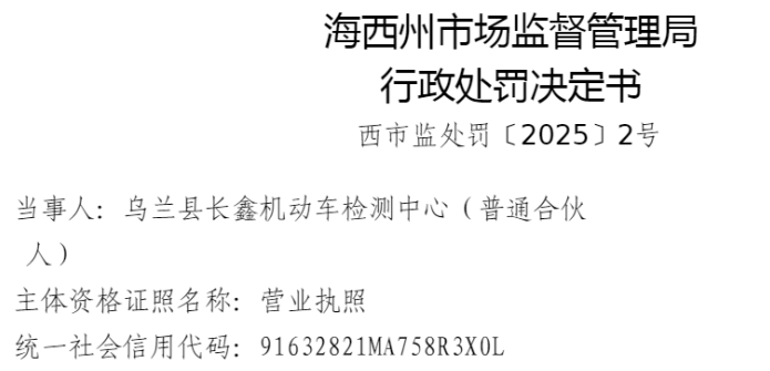 中国品牌与防伪杂志/中国消费品质量投诉网讯 近日,乌兰县长鑫机动车检测中心(以下简称“乌兰长鑫机动车检测中心”或“当事人”)因涉出具虚假检验检测报告的行为,依据相关法律法规,对该公司处以罚款70000元。
