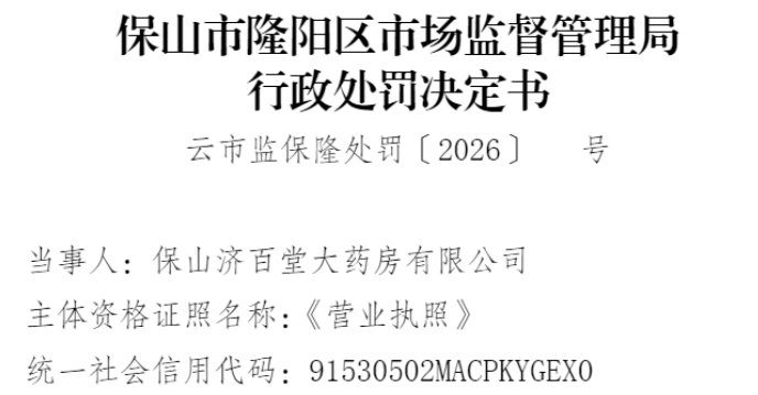 云市监保隆处罚〔2026〕号行政处罚决定书显示,2025年11月17日,保山市隆阳区市场监督管理局执法人员在当事人销售区域货架上查获13个品规超过有效期且未能提供供货商资质及随货同行单据等进货凭证材料的药品,因当事人未能提供供货商资质及随货同行单据等进货凭证材料,故无法准确计算货值金额和违法所得,参照当事人的陈述,上述药品货值金额为754元。