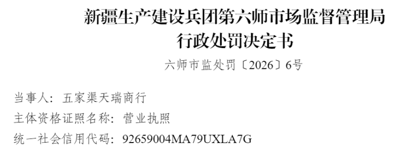 六师市监处罚〔2026〕6号行政处罚决定书显示,2025年10月27日,新疆生产建设兵团第六师市场监督管理局收到全国12315平台推送的投诉单,投诉人称2025年10月23日在当事人购买到超过保质期的食品。