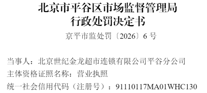 京平市监处罚〔2026〕6号行政处罚决定书显示,2025年7月20日,北京市平谷区市场监督管理局接到12345工单,相关举报人反映当事人涉嫌经营超过保质期的食品。
