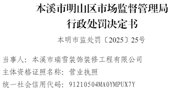 本明市监处罚〔2025〕25号行政处罚决定书显示,2025年7月29日,举报人提供相关证据材料,声称当事人为其装修过程中,存在不依照约定提供材料的行为,当事人提供的钢化玻璃无相应的工厂代码。
