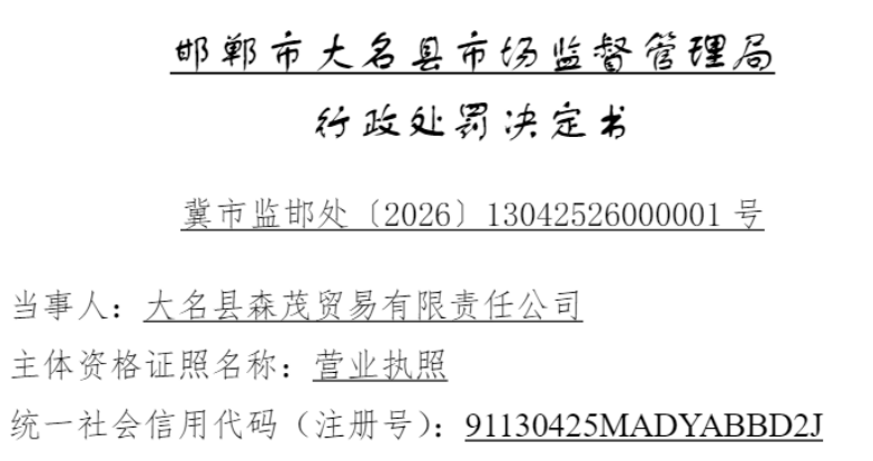 中国品牌与防伪杂志/中国消费品质量投诉网讯 近日,大名县森茂贸易有限责任公司(以下简称“大名森茂贸易”或“当事人”)因涉发布违法广告,依据相关法律法规,对该公司处以罚款10000元。