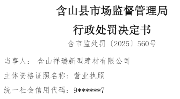 中国品牌与防伪杂志/中国消费品质量投诉网讯 近日,含山祥瑞新型建材有限公司(以下简称“含山祥瑞建材”或“当事人”)因涉销售不合格产品,依据相关法律法规,对该公司处以罚没款500元。