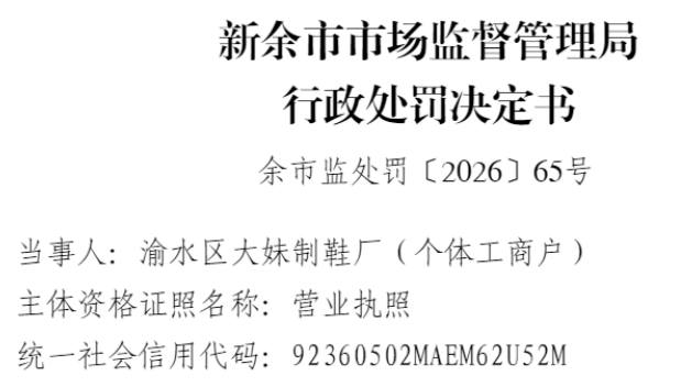 中国品牌与防伪杂志/中国消费品质量投诉网讯 近日,新余市渝水区大妹制鞋厂(以下简称“新余大妹制鞋厂”或“当事人”)因涉生产侵犯注册商标专用权的产品,依据相关法律法规,对该公司处以罚款16068元。