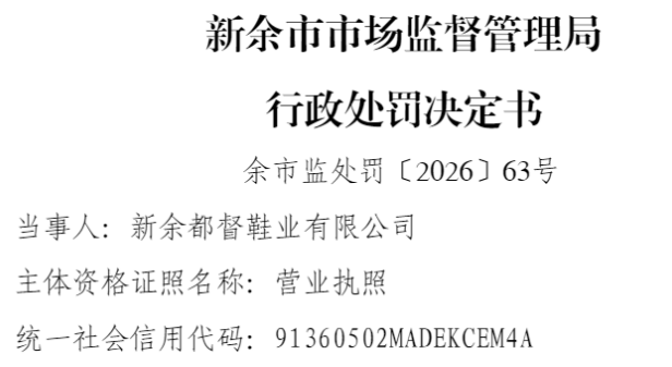 余市监处罚〔2026〕63号行政处罚决定书显示,2025年11月6日,接阿迪达斯体育(中国)有限公司举报称当事人未经授权许可,擅自生产侵犯阿迪达斯体育(中国)有限公司注册商标的鞋子。请求新余市市场监督管理局依法对当事人经营场所进行检查,并责令其停止侵权行为;没收、销毁侵权商品和制造工具;对被投诉人的违法行为进行处罚。当日,新余市市场监督管理局执法人员在当事人生产经营场所核查发现其成品仓储区存放有鞋帮、鞋面图案标识与阿迪达斯体育(中国)有限公司注册商标第3938968号、第G730835号相近似的成品女鞋1960双。该1960双女鞋为当事人生产,当事人未能提供商标权利人的授权许可。
