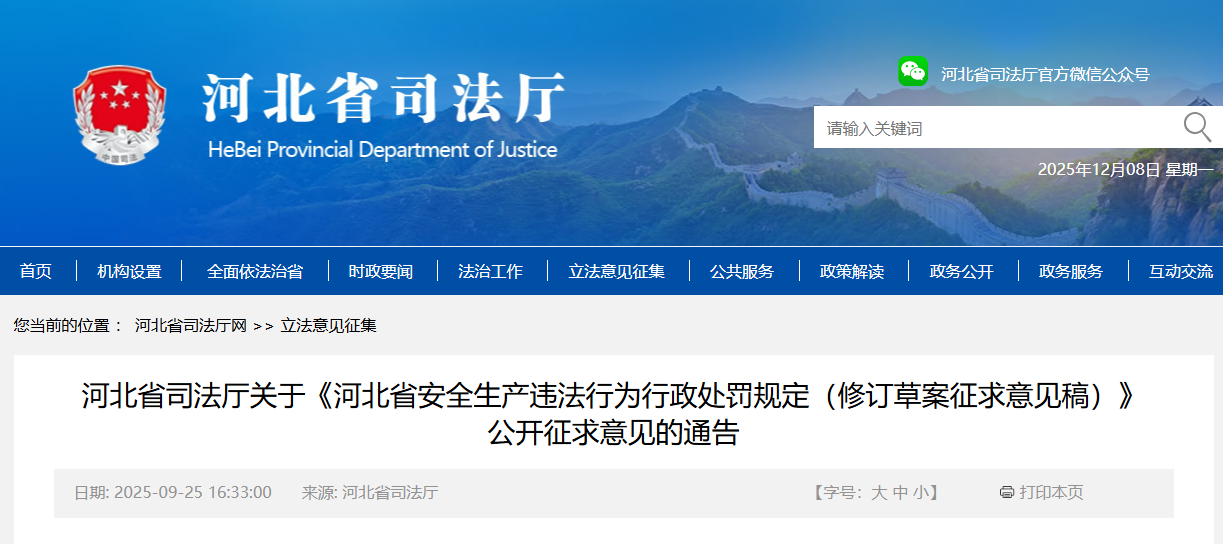 为了规范对安全生产违法行为的行政处罚,依法惩治安全生产违法行为,保障安全生产,保护公民、法人和其他组织的合法权益,我厅会同省应急管理厅起草了《河北省安全生产违法行为行政处罚规定(修订草案征求意见稿)》。现面向社会公开征求意见,欢迎社会各界积极参与,提出建设性意见和建议。有关意见建议可以在2025年10月25日前,通过以下途径和方式提出: