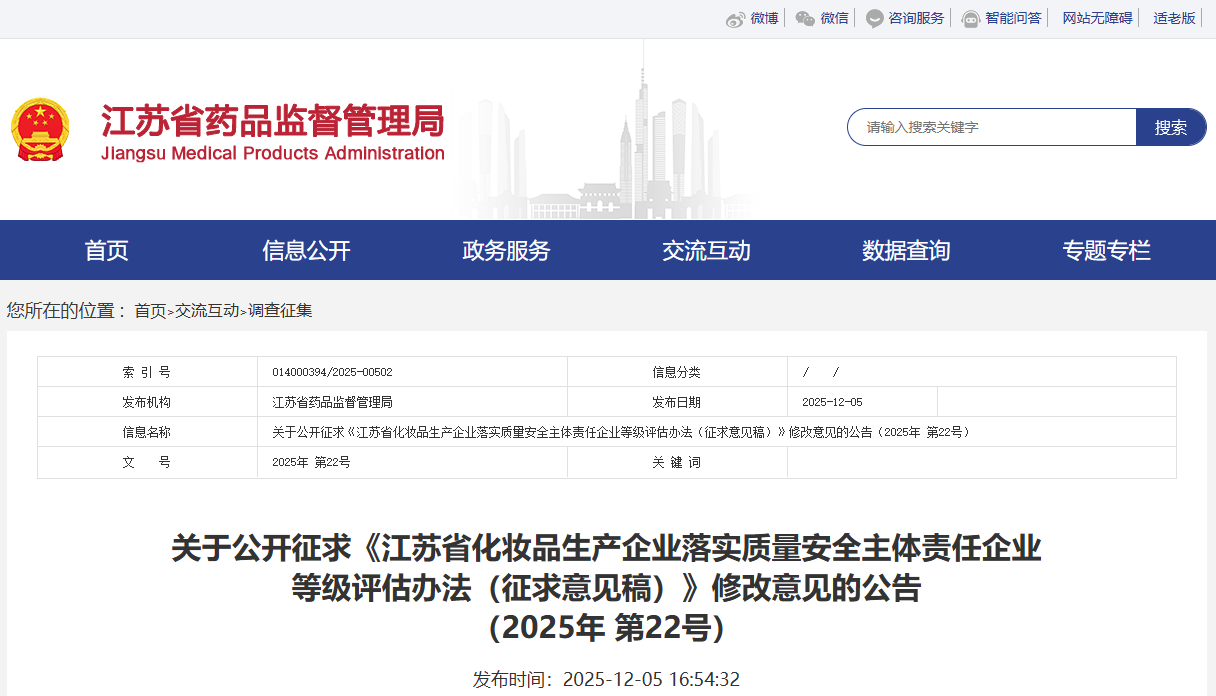 为认真贯彻实施《企业落实化妆品质量安全主体责任监督管理规定》(国家药品监督管理局2022年第125号公告),督促化妆品生产企业有效落实质量安全主体责任,我局研究起草了《江苏省化妆品生产企业落实质量安全主体责任企业等级评估办法(征求意见稿)》(附件1),现向社会公开征求意见。
