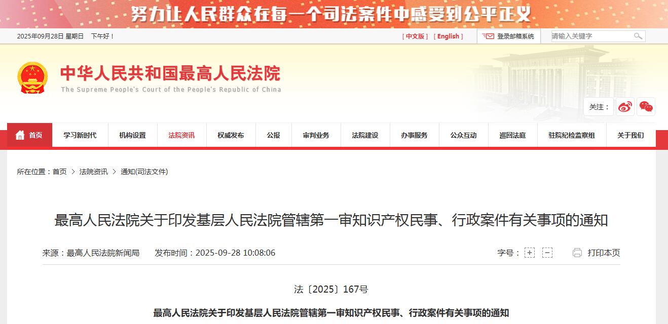 根据《最高人民法院关于第一审知识产权民事、行政案件管辖的若干规定》(法释〔2022〕13号),结合知识产权审判实际,最高人民法院对具有知识产权民事、行政案件管辖权的基层人民法院及其管辖区域作了调整。现予以印发,自2025年10月1日起施行。